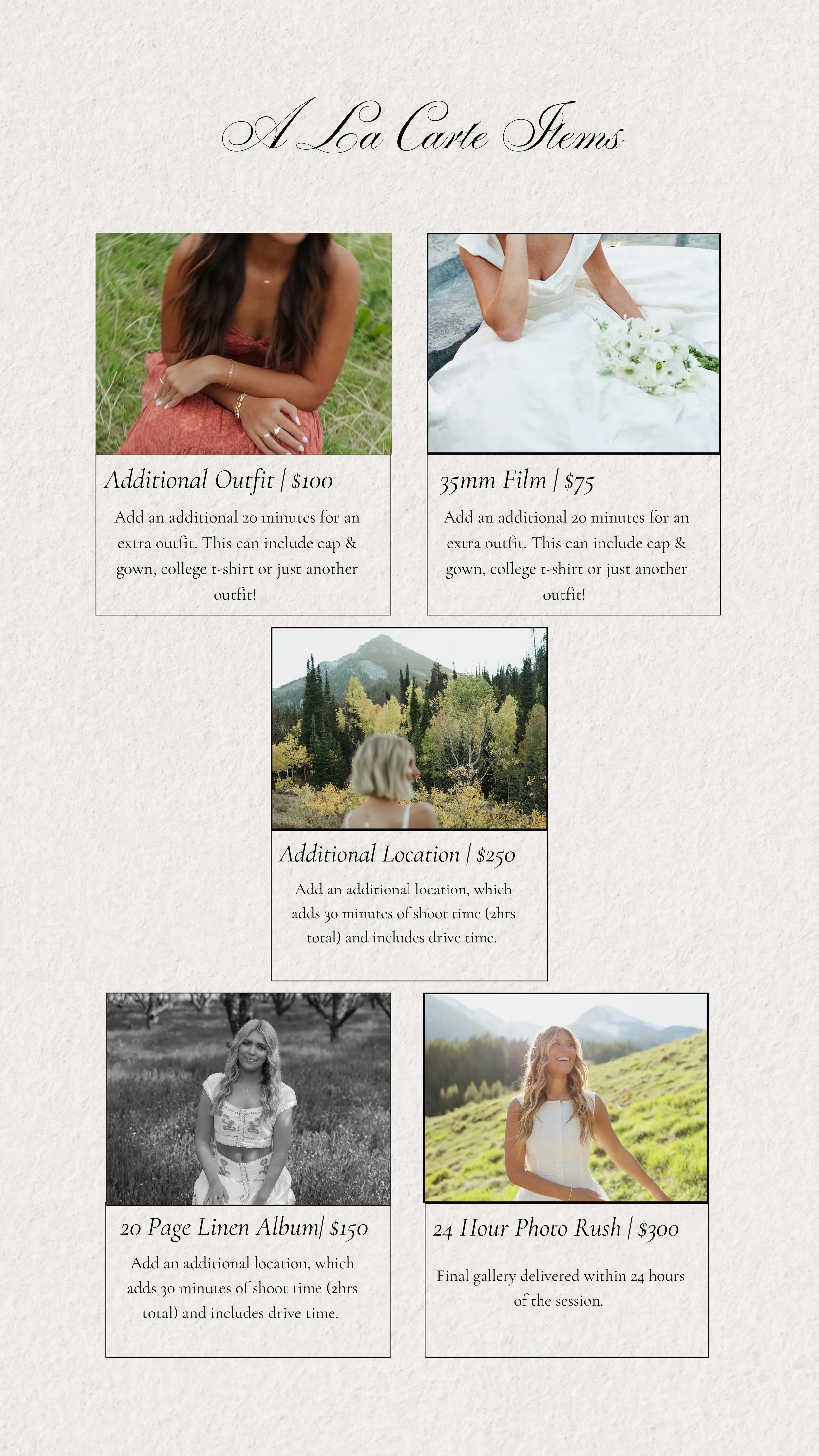Payment plans can be broken up into 2-4 separate payments. I take payment through an invoice that I will send you once you decide which package works best for you!